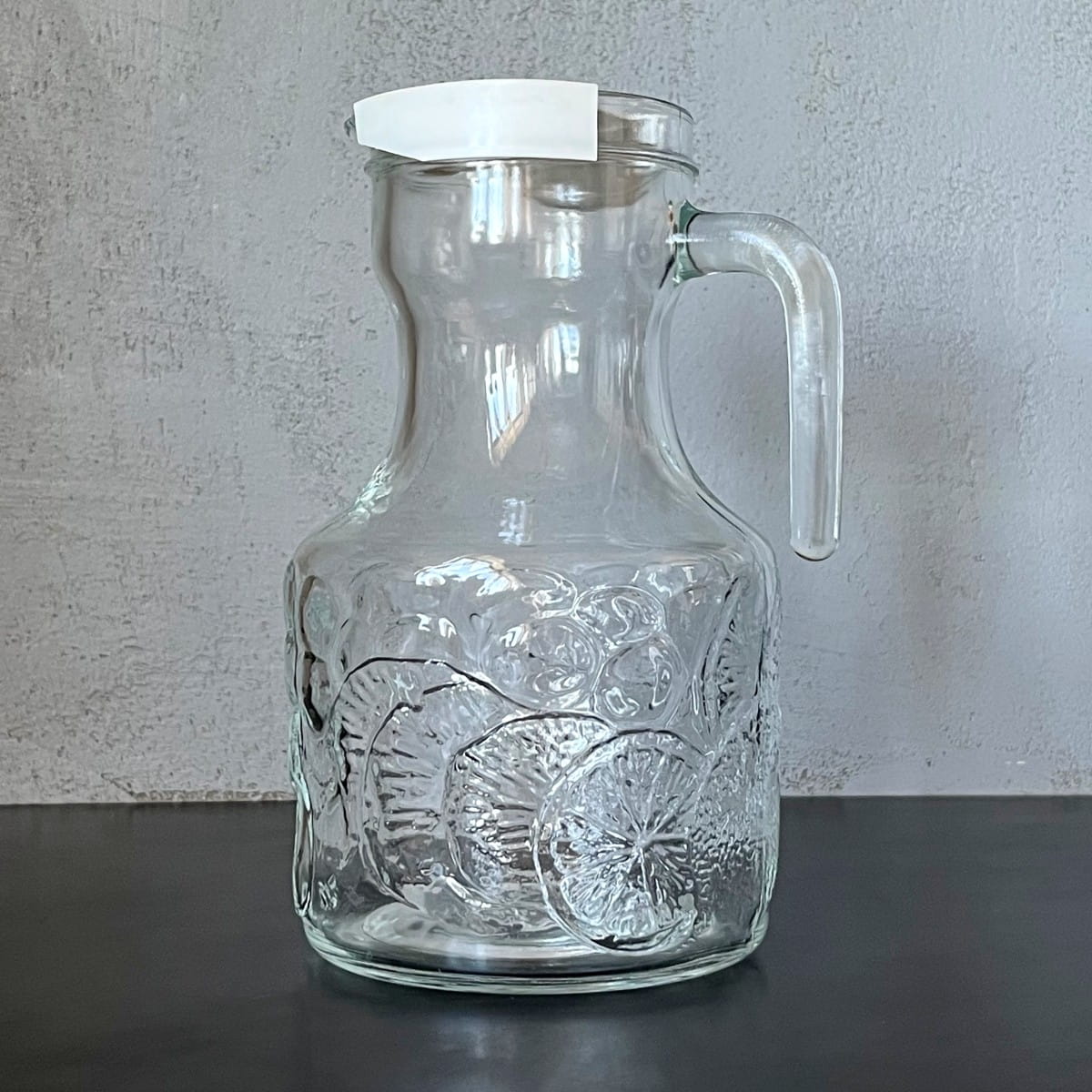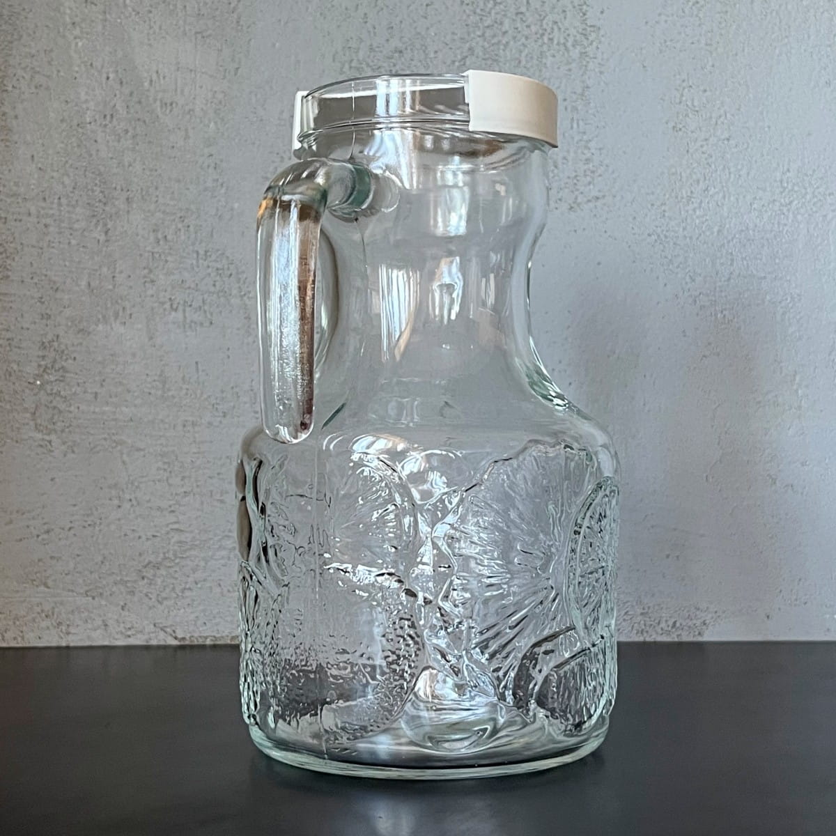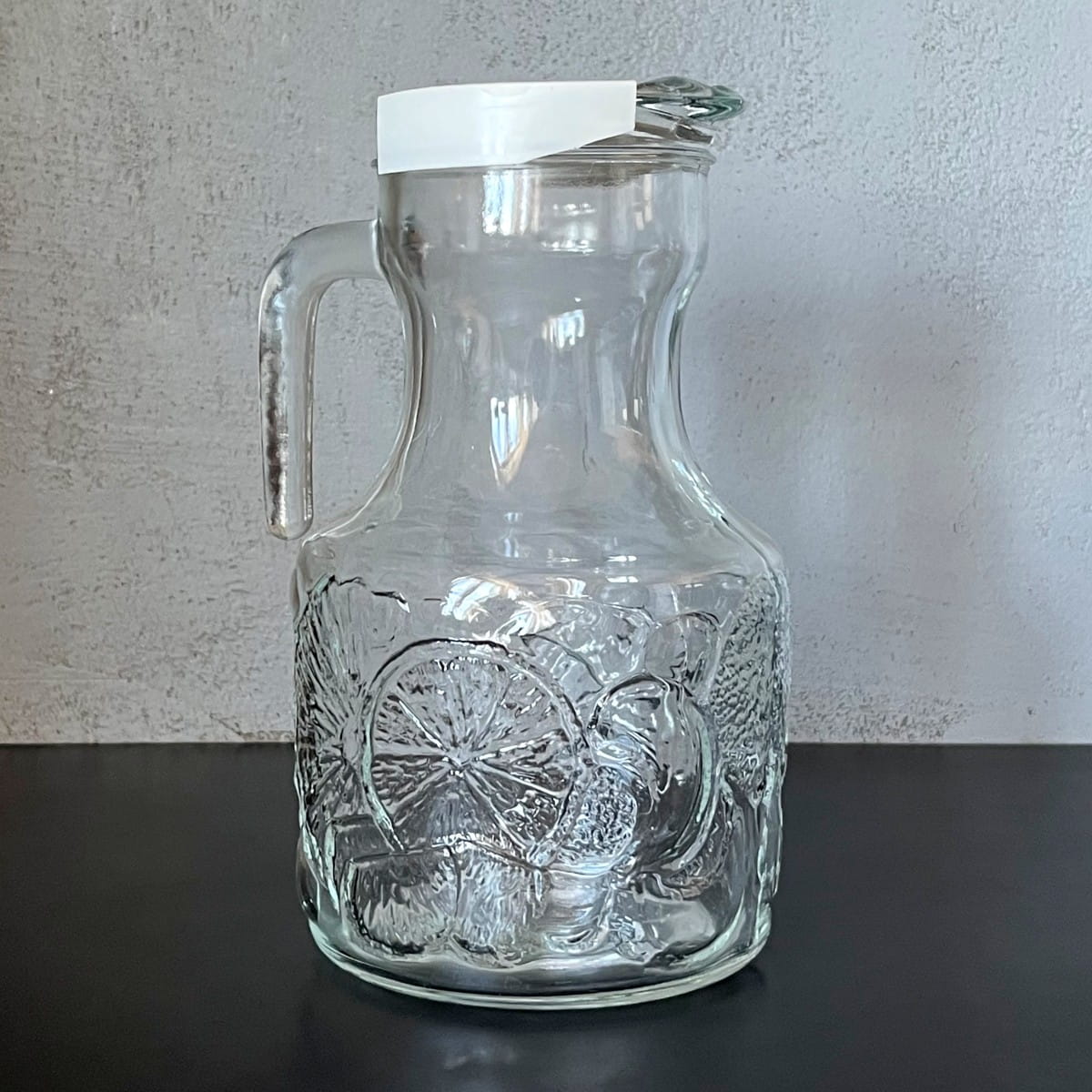 Serwis do napojów pochodzący z lat 70. wykonany we Włoszech z bezbarwnego szkła w tłoczone owocowe wzory.