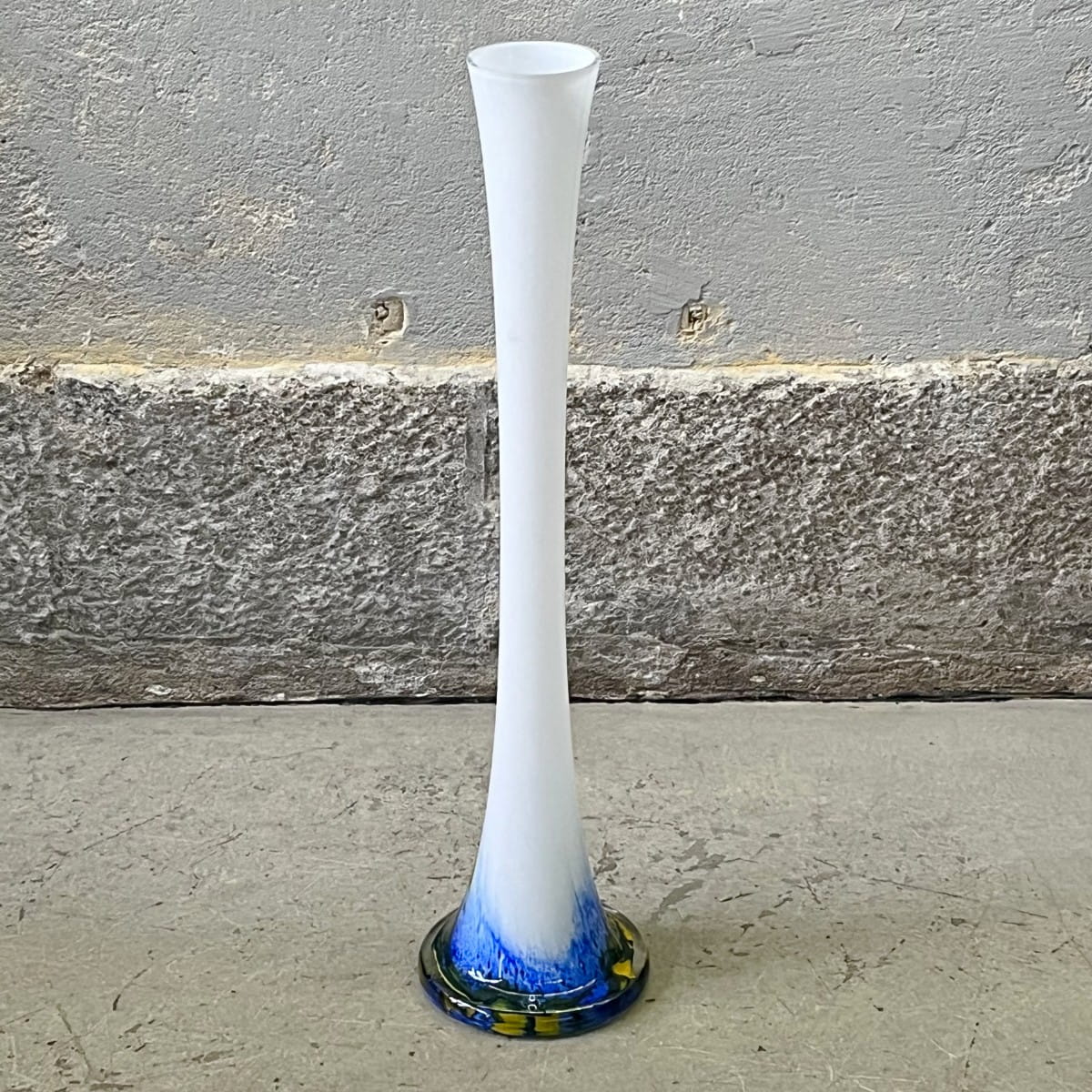 Smukły wysoki wazon wykonany ze szkła artystycznego w stylu Murano. Ma bardzo ciekawą formę i kolorystykę. Uformowany w kształcie wydłużonej klepsydry. Wazon jest biały z pięknie wybarwioną podstawą w kolorze kobaltowym i żółtym. Prezentuje się znakomicie.