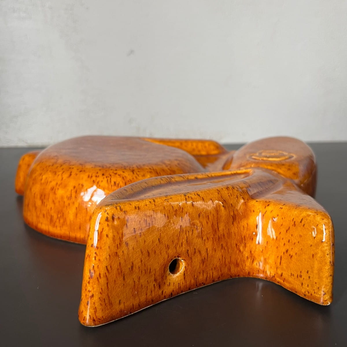Urocza ceramiczna foremka lub ozdoba ścienna w kształcie zająca. Wykonana z ceramiki, pokryta lśniącym szkliwieniem w odcieniu miodowego brązu, nakrapianym ciemniejszymi kropeczkami. Rysunek zająca ma nowoczesny modernistyczny charakter. Uwzględniono najważniejsze jego cechy czyli wielkie uszy, silne tylne łapy i czujne spojrzenie. Zając przyciąga wzrok i stanowi ciekawy dodatek wnętrzarski. Posiada zawieszkę, można ozdobić nią dowolną ścianę.
